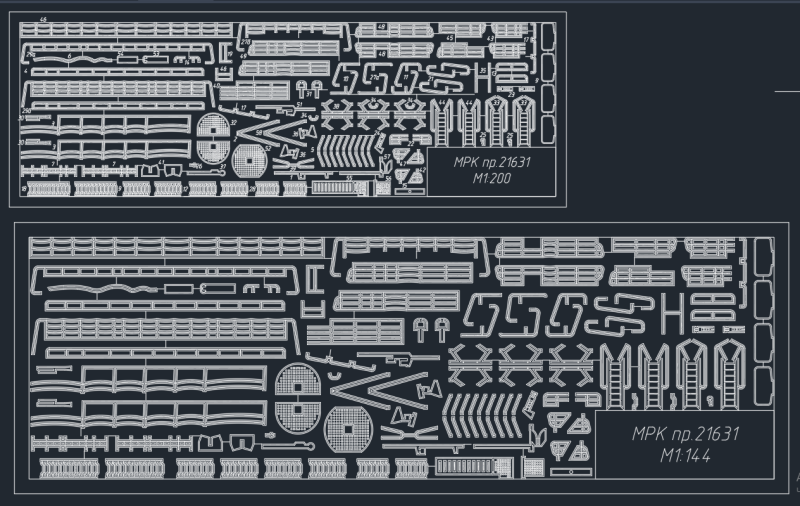 Добавлен: 07.10.2025 14:36:34Когда «КАмпас» заявил о работе над моделью МРК пр.21631 «Буян» в масштабах 1:200 и 1:144, я неопределенно хмыкнул на манер Кисы Воробьянинова: «Да, уж». Но Дмитрий Куликов работал: без драмы, без нервов, без итальянского «ма че коза» (что за черт), и вот уже виден результат работы по 200-му масштабу. В этом масштабе длина модели 36 см. Подключился и я, готовые макеты фототравления для 200 и 144 масштабов в ближайшие дни будут отправлены заказчику. Последний раз редактировал(а): ashev61 (08.10.2025 07:44:12). Всего редактировалось: 1 раз(а).