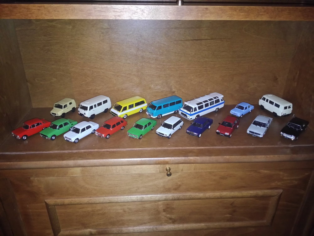 | 1 | ГАЗ-24-02 с прицепом-дачей и лодкой (GENERAL 813 (Ростов-на-Дону)) [1972г., бутылочный, 1:43] | | 2 | ГАЗ-3102 (GENERAL 813 (Ростов-на-Дону)) [1981г., бутылочный, 1:43] | | 3 | Конверсия ВАЗ-2105 VFTS из агатовской ВАЗ-2105 (Агат, конверсия Michalych) [1980г., бежевый с декалями, 1:43] | | 4 | ВАЗ-2107 VFTS ралли (конверсия Michalych из агатовской ВАЗ-2107) [1984г., белый с декалями, 1:43] | | 5 | ВАЗ-2106 (конверсия Michalych из агатовской ВАЗ-2101) [1976г., синий, 1:43] | | 6 | МОСКВИЧ 408 от DINKY TOYS цельнолитой, (DINKY TOYS, Франция, 1968 год) [1964г., вишневый, 1:43] | | 7 | ГАЗ-24-02 ГАИ (Тантал, конверсия General 732, РФ) [1972г., желтый с спецокраской, 1:43] | | 8 | ИЖ-Юпитер 2К (Тантал, доработка General 732, РФ) [1965г., канареечный, 1:24] | | 9 | УАЗ-452В (А41) (Тантал, конверсия General 732, РФ) [1965г., желтый с спецокраской, 1:43] | | 10 | Волга кемпер (Ручная работа) [1990г., белый,голубой, 1:43] |