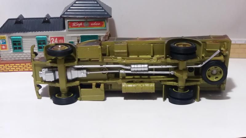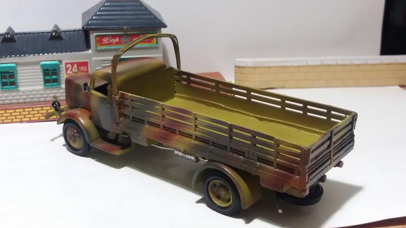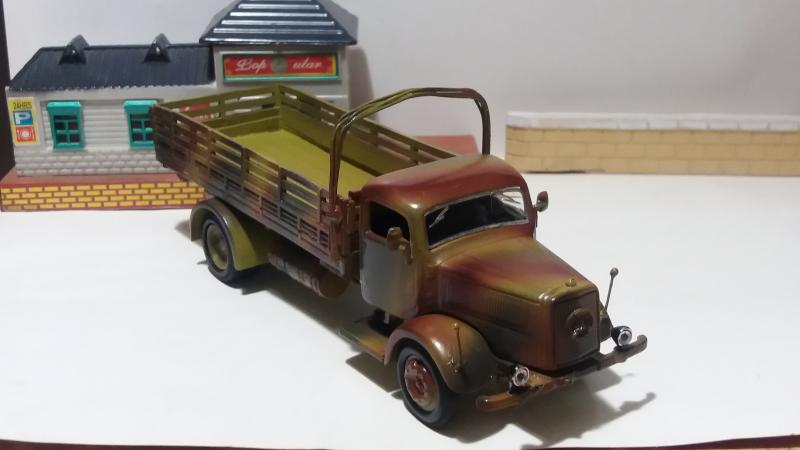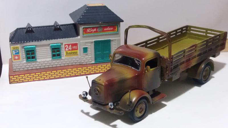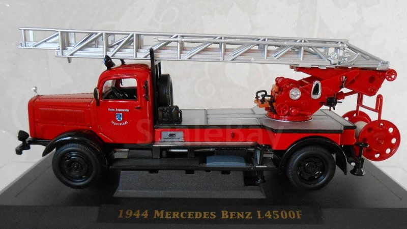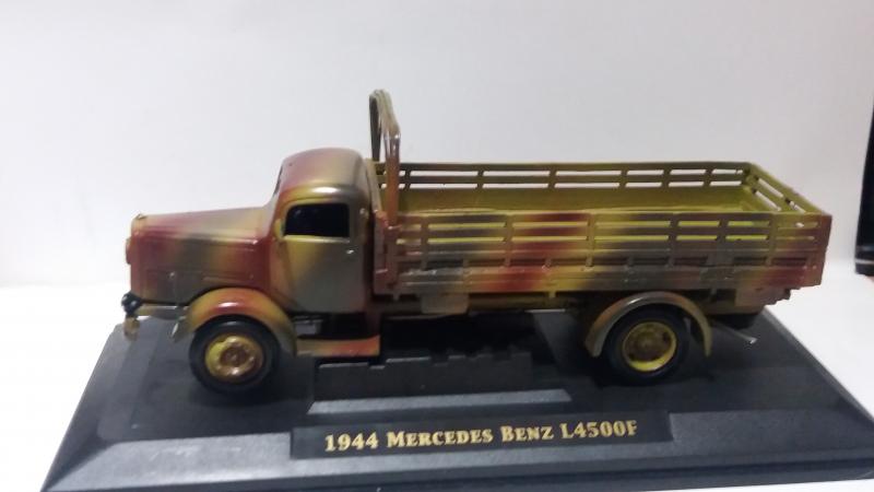 Когда приобрел пожарную лестницу на базе Мерседес-Бенц L4500F от "Signature", начал интересоваться историей. Позже выяснил, что большое количество этих машин после Победы в 1945 году было вывезено в СССР. На базе их установок в послевоенной стране начали строить пожарные лестницы АЛ-17 (51) на базе ГАЗ-51. Определив сходство установок, решил собрать советскую АЛ-17(51). Вместе с этим в источниках нашел такой факт, что модель военного грузовика Мерседес-Бенц L4500F существует только в масштабах 1:35 и 1:72. В масштабе 1:43 выпускалась только "Signature" в варианте пожарной лестницы. Как следствие - решил сделать из остатков конверсии армейский грузовик в 1:43. У модели была слабо проработана рама. Пришлось из "плиты" вырезать и "доклеивать" полноценную раму. Кузов собрал из различных остатков от других, оставшихся после конверсии. За образец грузовика взял модель от "Звезды", выпускавшейся в 1:35. Окраску, характерную для восточного фронта 1943-1945 годов, подобрал по материалам из истории Великой отечественной войны.