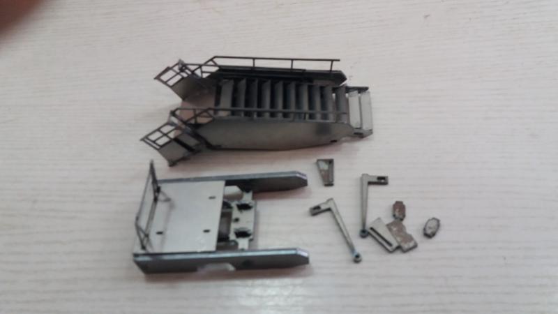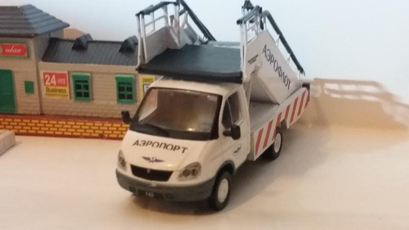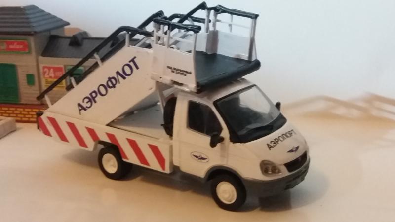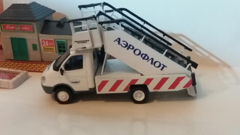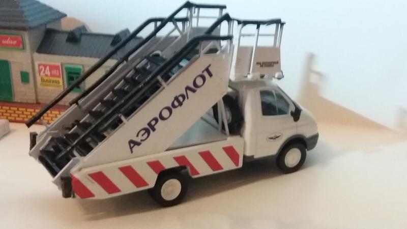 Недавно, приобретая запчасти для саратовских моделей, обратил внимание на КИТ, выполненный из металла. Это был авиационный трап ТПС-22-1 НА шасси ГАЗ-3302. Поскольку доставка итак оплачивалась, взял его "до кучи". Тем более, что при изготовлении одной из конверсий осталось необходимое шасси Газели. КИТ был выполнен путем лазерной прорезки контуров деталей в листах металла. Кахждую деталь приходилось подгонять надфилем. Далее - сборка, грунтовка, покраска, установка на шасси (штатные крепления КИТа и рамы модели совместились исключительно точно), нанесение декалей. На перила трапа одел изоляцию провода. Трап выдвигается, также выдвигается передок верхней платформы. Также опускается входная лесенка, установленная внизу трапа. Для упора к самолету добавил резиновый буфер, также из резиновой изоляции от проводки.