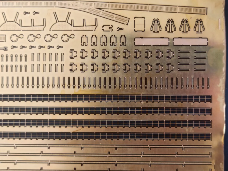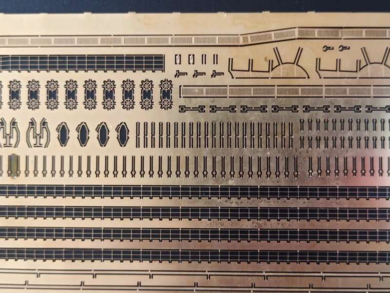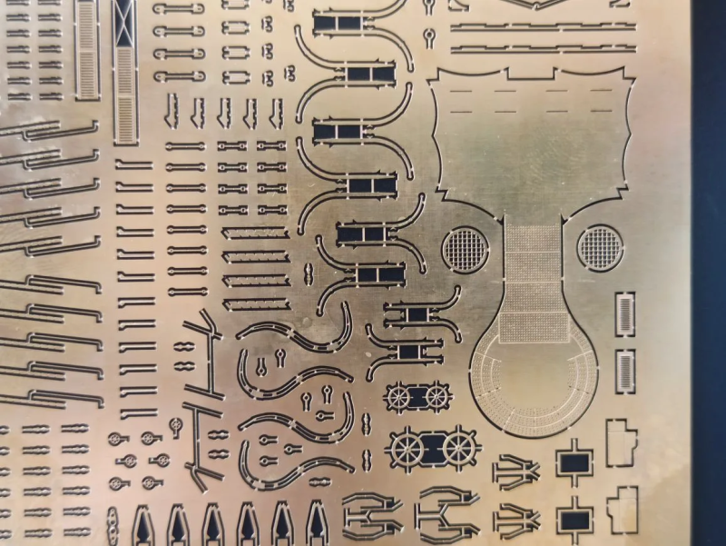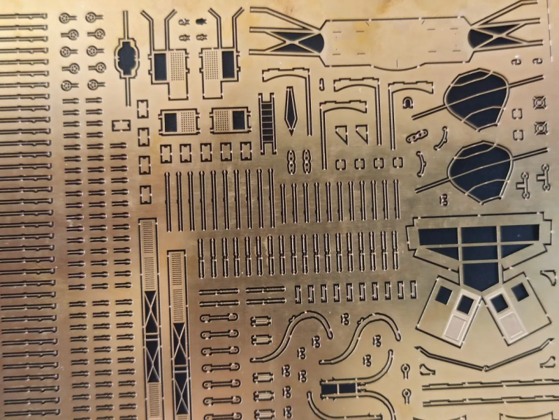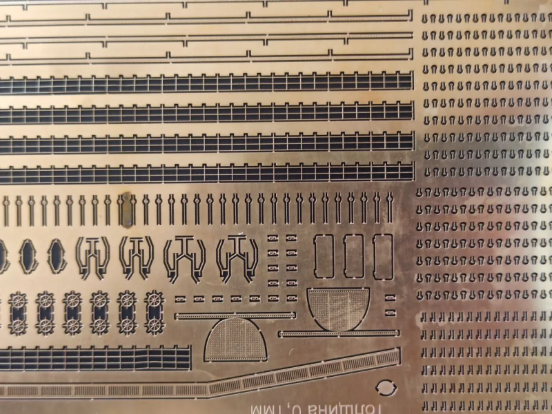 По очередному результату мнение мастера такое: «В моём понимании 8 из 10. Пара мелких деталей ушло в атмосферу. Скорее всего повредили фоторезист (совсем рядом совершенно одинаковые детали нормально протравились). Ну и во многих местах отверстия 0,12мм в металле на сквозь не протравились (леерные стойки, талрепы, маховики...)»